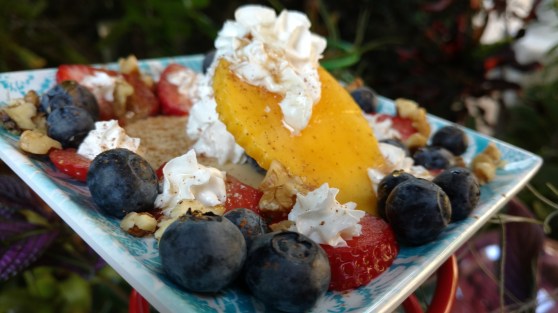 [recipe title=”My Flirty Little Granola” servings=”4″ time=”30 minutes” difficulty=”easy” description=”Say hello to my little friends! A little mango, a little banana, a little kiwi, a little strawberry, a little bit of granola, a little sliced almonds, a little coconut topped cinnamon, a little whipped cream, a little coconut milk, a little mint and a little squirt of fresh lime juice.”]